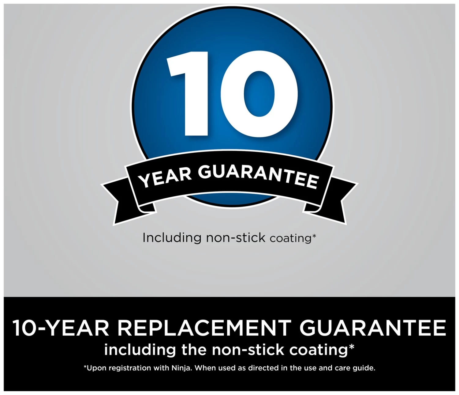 This 5-piece stacking pan set includes 16cm, 18cm and 20cm saucepans with heat tempered glass lids, plus 20cm and 24cm frying pans. Ninja offers a 10 Year Replacement Guarantee, including the non-stick coating. Upon registration with Ninja. When used as directed in the use and care guide.