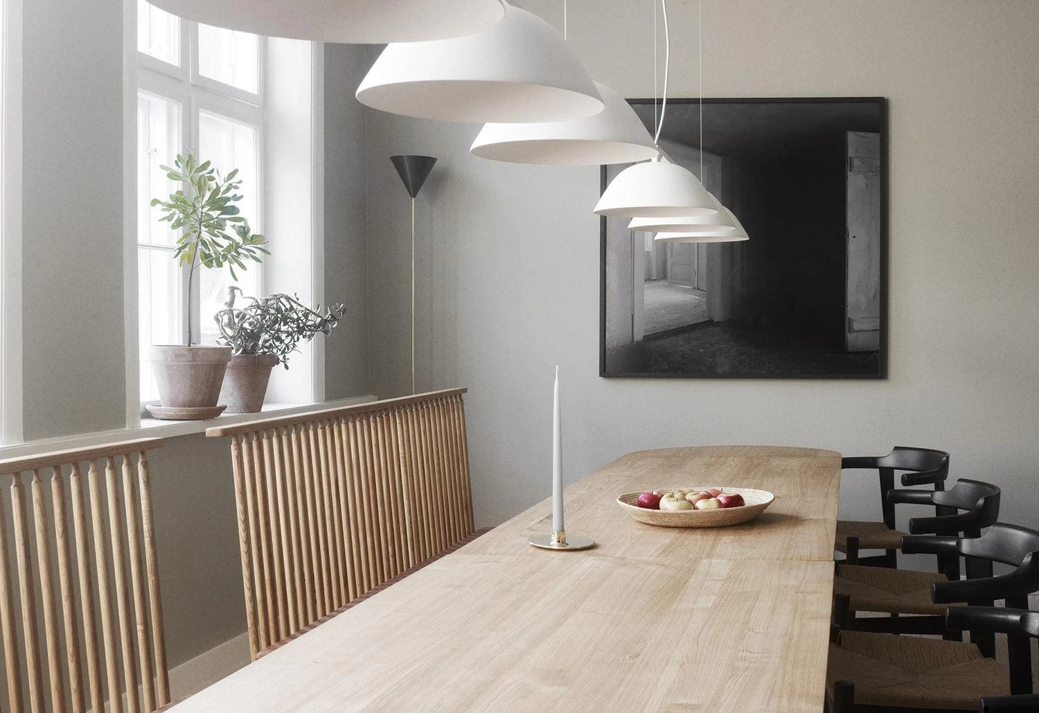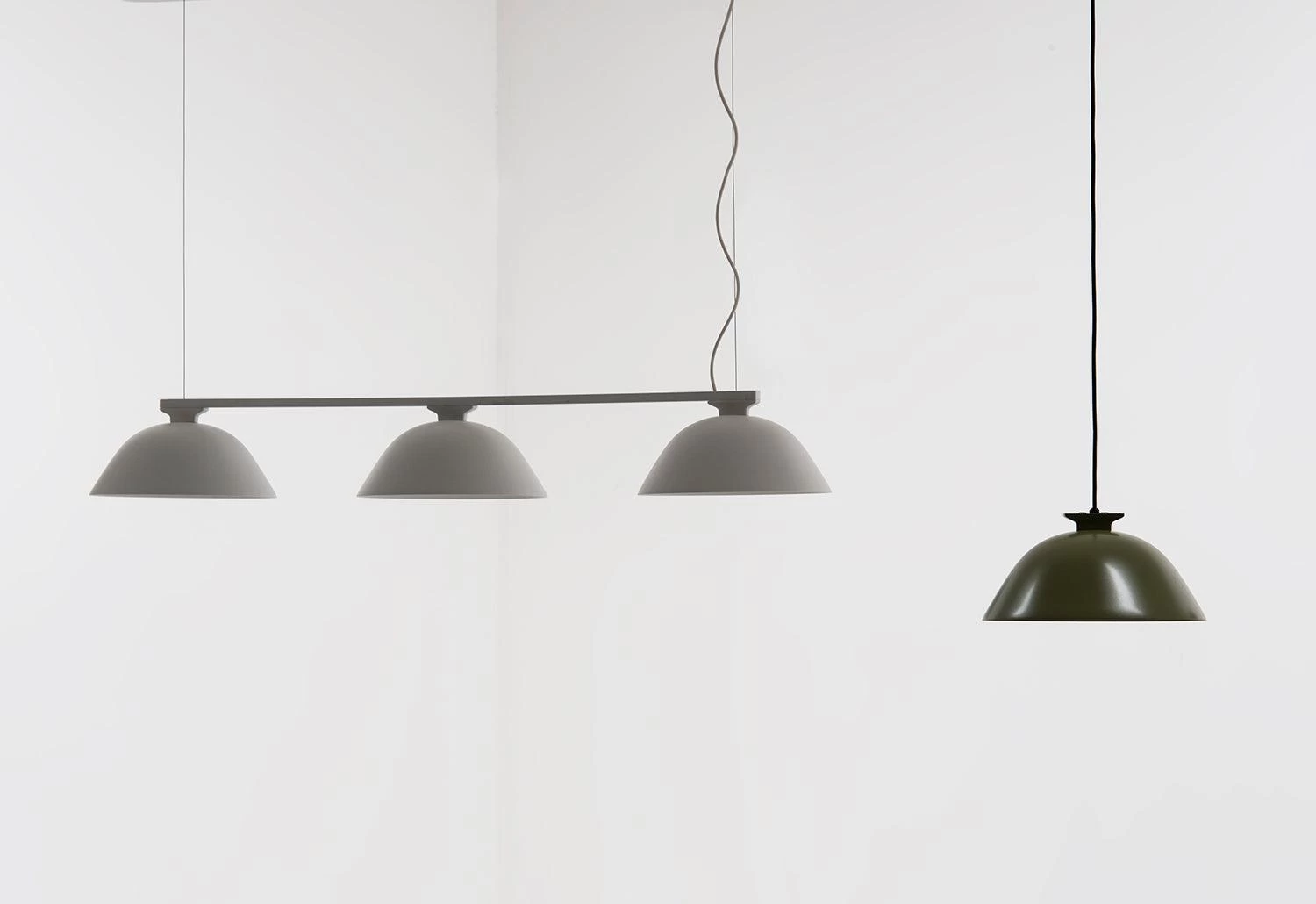 Two elements of the w103 range table lamp are used in the suspended lamps: the shade is identical and the hook of the clamp is moved to the top of the shade. This then becomes the assembly piece of all the various shade combinations’. Inga Sempé